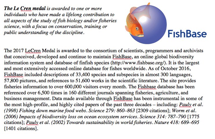 Congratulations to the @FishBaseProject Consortium. LeCren Medal a worthy accolade for creating such an amazing resource. See you @FSBI17